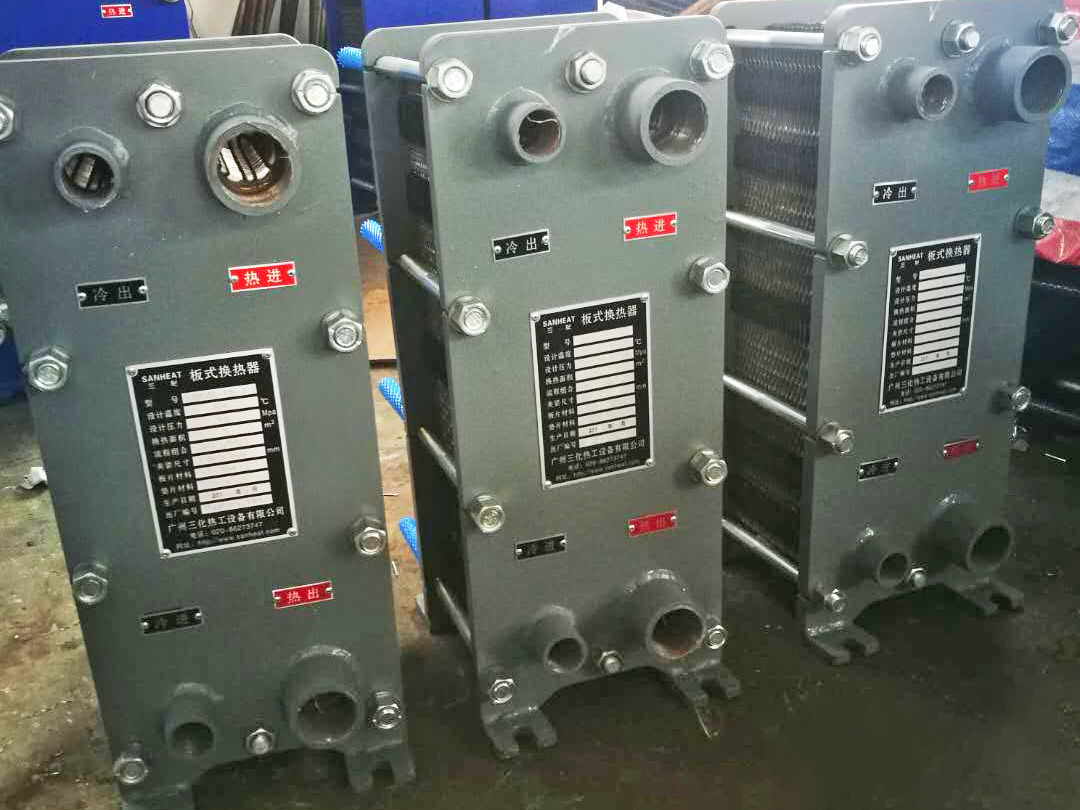 板式换热器是由许多换热板片(冲压有波纹槽的金属薄板),按一定间隔四周通过密封垫片密封,并用夹紧螺柱压紧而成,其角上的孔构成了连续的通道,介质从入口进入通道,并被分配到换热板片之间的流道内,每张板片都有密封垫片,板与板之间的位置是交替放置,两种流体,分别进入各自通道,由板片隔开,一般情况下,两种介质在通道内逆流流动,热介质将热能传递给板片,板片又将热能传递给另一侧的冷介质,从而达到热介质温度降低被冷却,冷介质温度升高得到加热的目的。